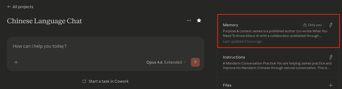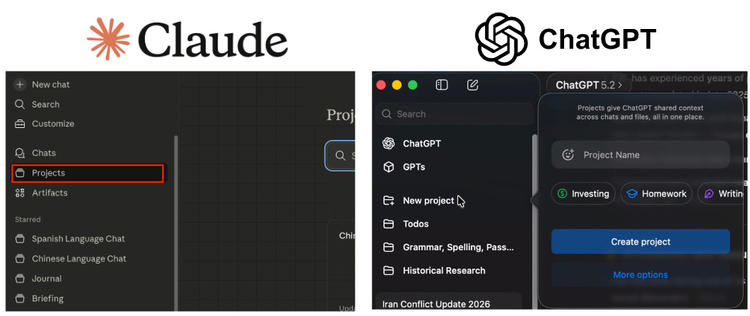 Both Claude and ChatGPT (and many others) have the ability to store “memories” to intelligently bring in context from other conversations (or at least they purport to—I’m often not impressed by the “intelligently” part of bringing in context). More importantly, both have Project-level memories.