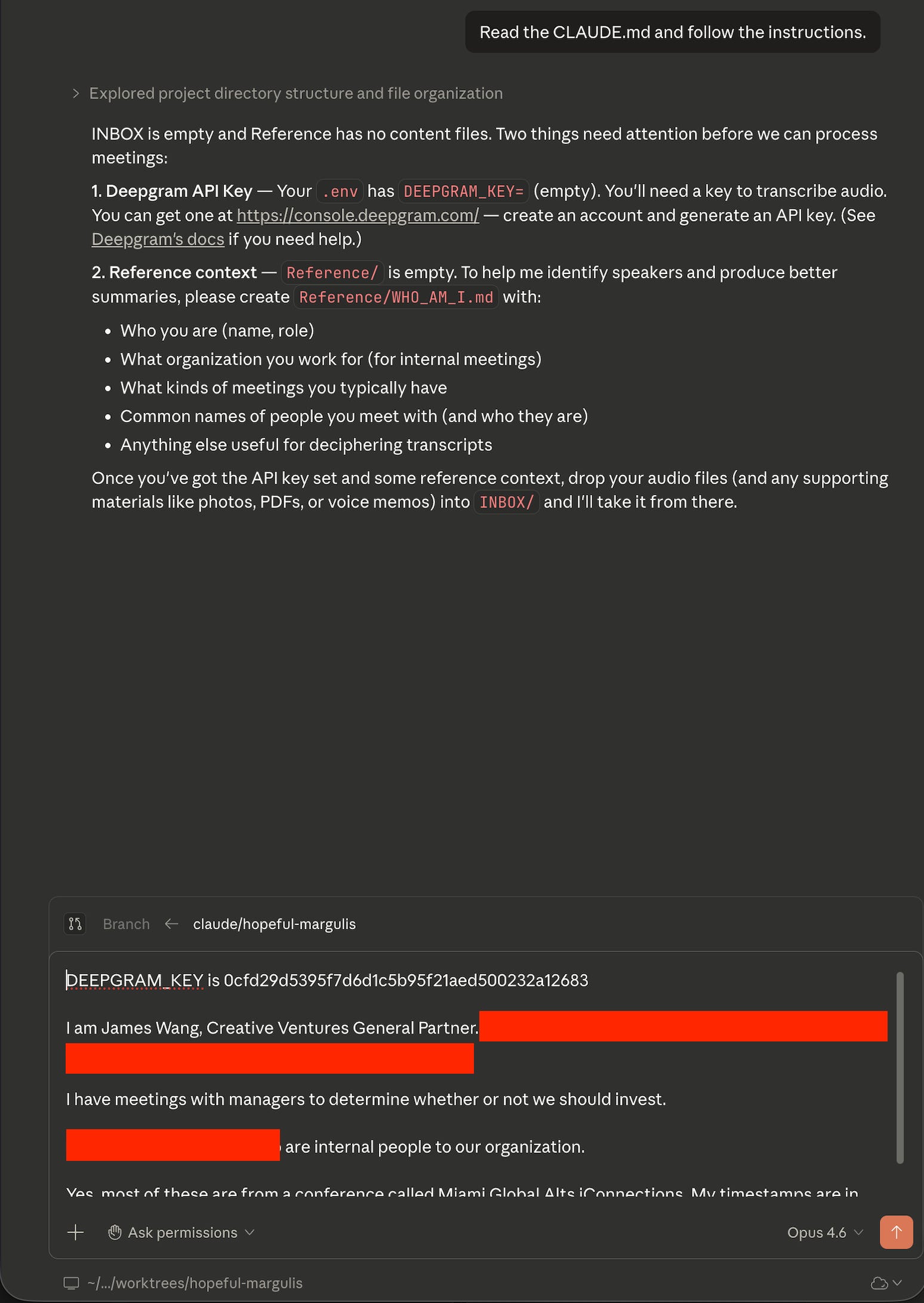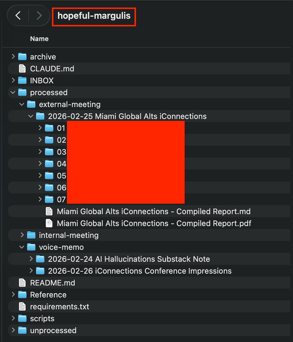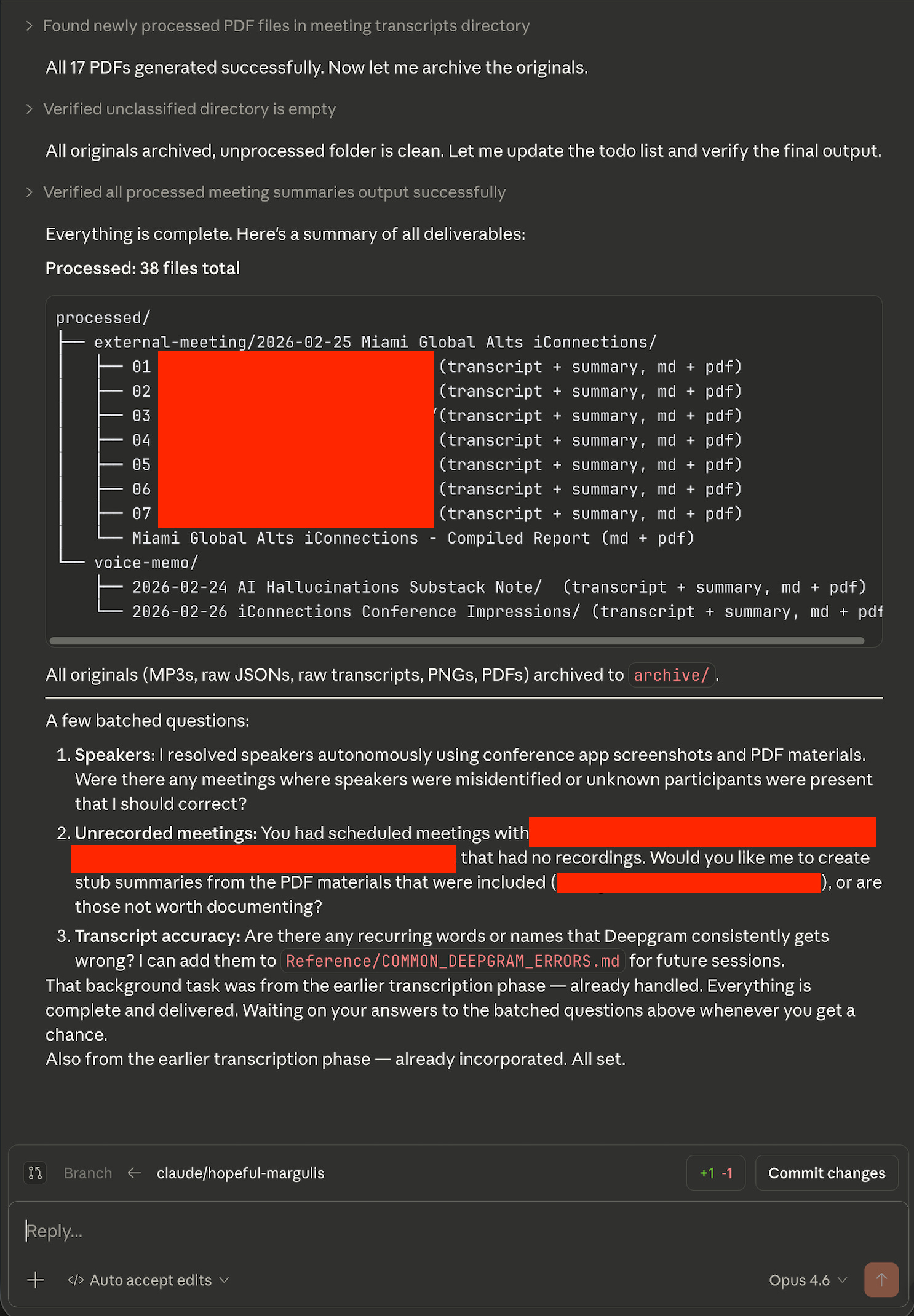 Using context from the PDFs and the schedule and asking me questions (... in this case, there was enough info to ask zero questions), Claude cleaned up all of the transcripts with names and fixed things that Deepgram obviously “misheard” (e.g., “Mall” to “Vol”/volatility).