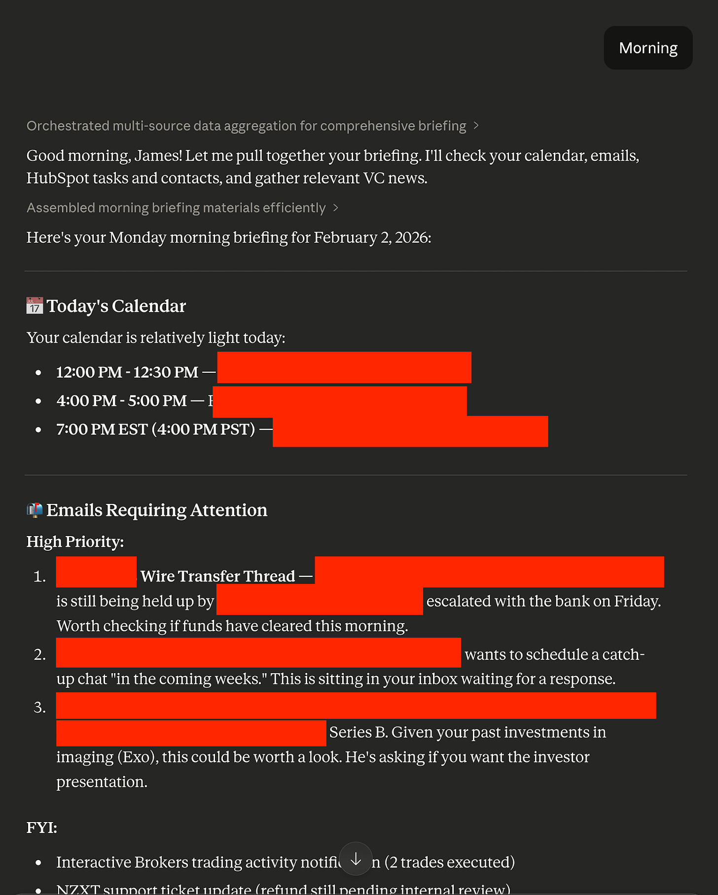 Just to note: given how many data sources it uses (email, calendar, HubSpot, to-do list, email newsletters, etc.), it actually takes a while. It’s fine if you want to just say “morning” and walk away, but if you were hoping to sit down with it immediately with a coffee... well, you’re going to need to come back in 5 minutes. I’m sure you can guess why I ended up turning it into a fully automated flow.