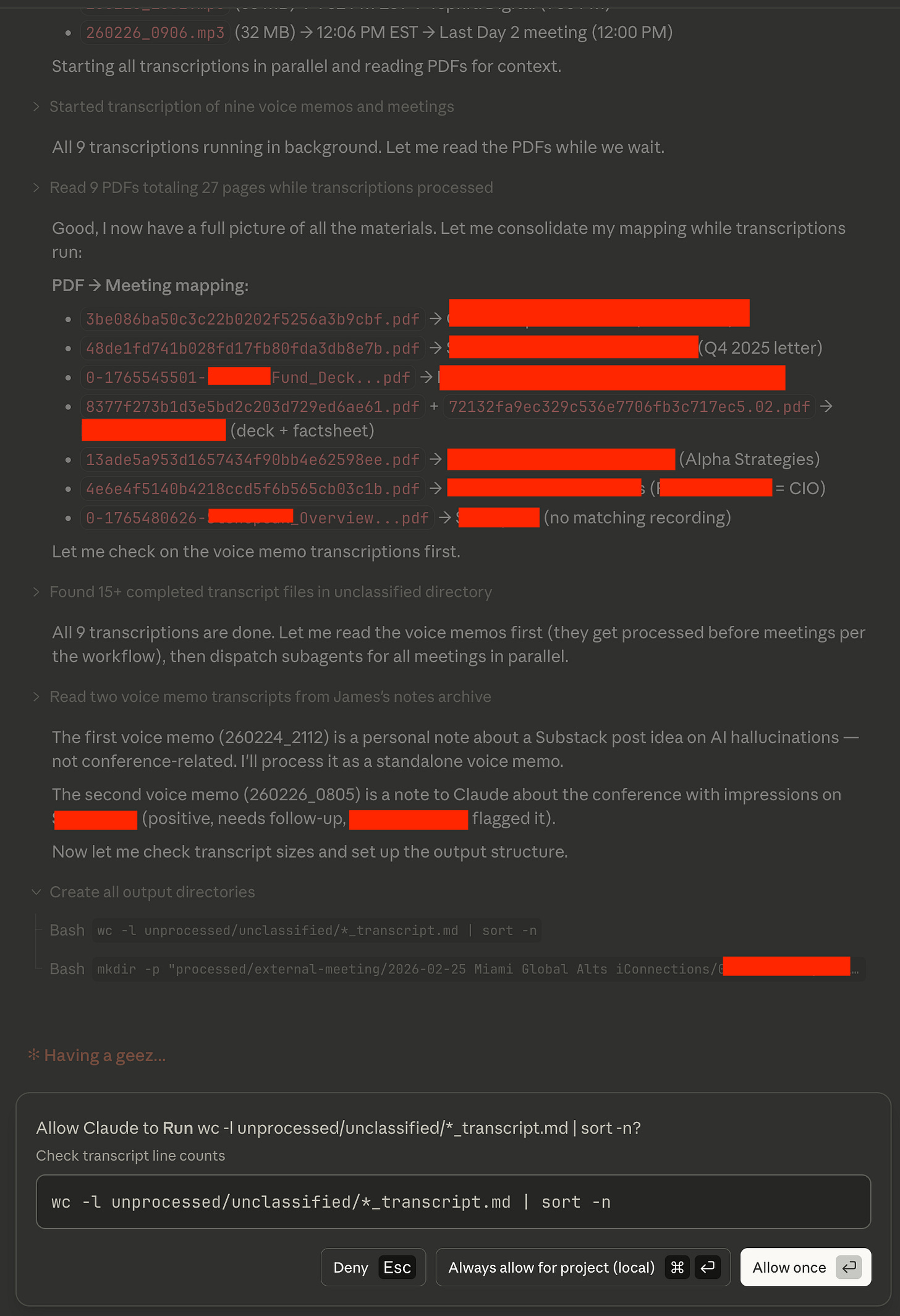 As a reminder, my original example had seventeen meetings. These were composed of eight hours of recording, over a thousand pages of PDFs, and a bunch of screenshots of my calendar/schedule showing who I was meeting with and when.