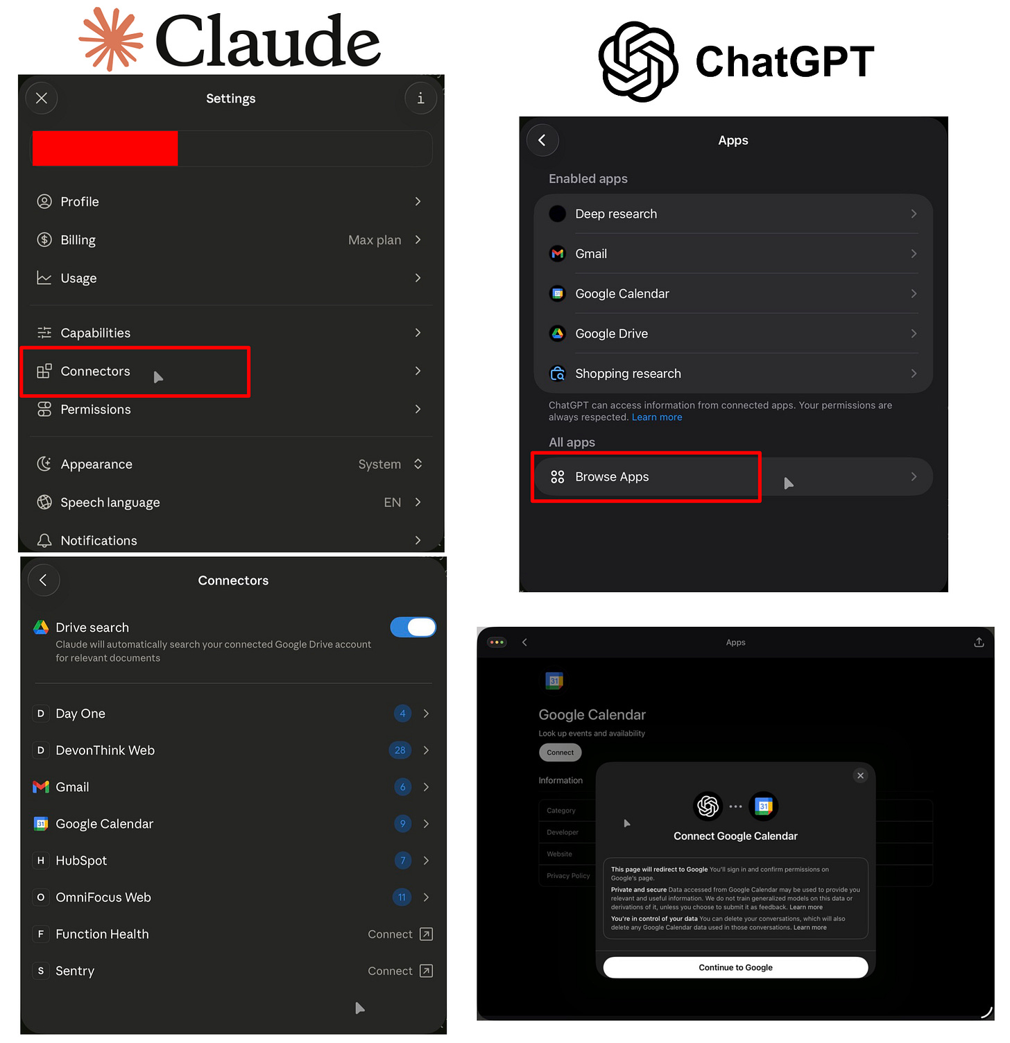 Obviously, nowadays I use Claude more, so it has both more connectors as well as my custom-built ones (”DevonThink Web,” “Omnifocus Web,” and even “Day One”—which, despite not having “web” in its name, is actually also one of my custom “web wrappers” around Day One’s MCP).