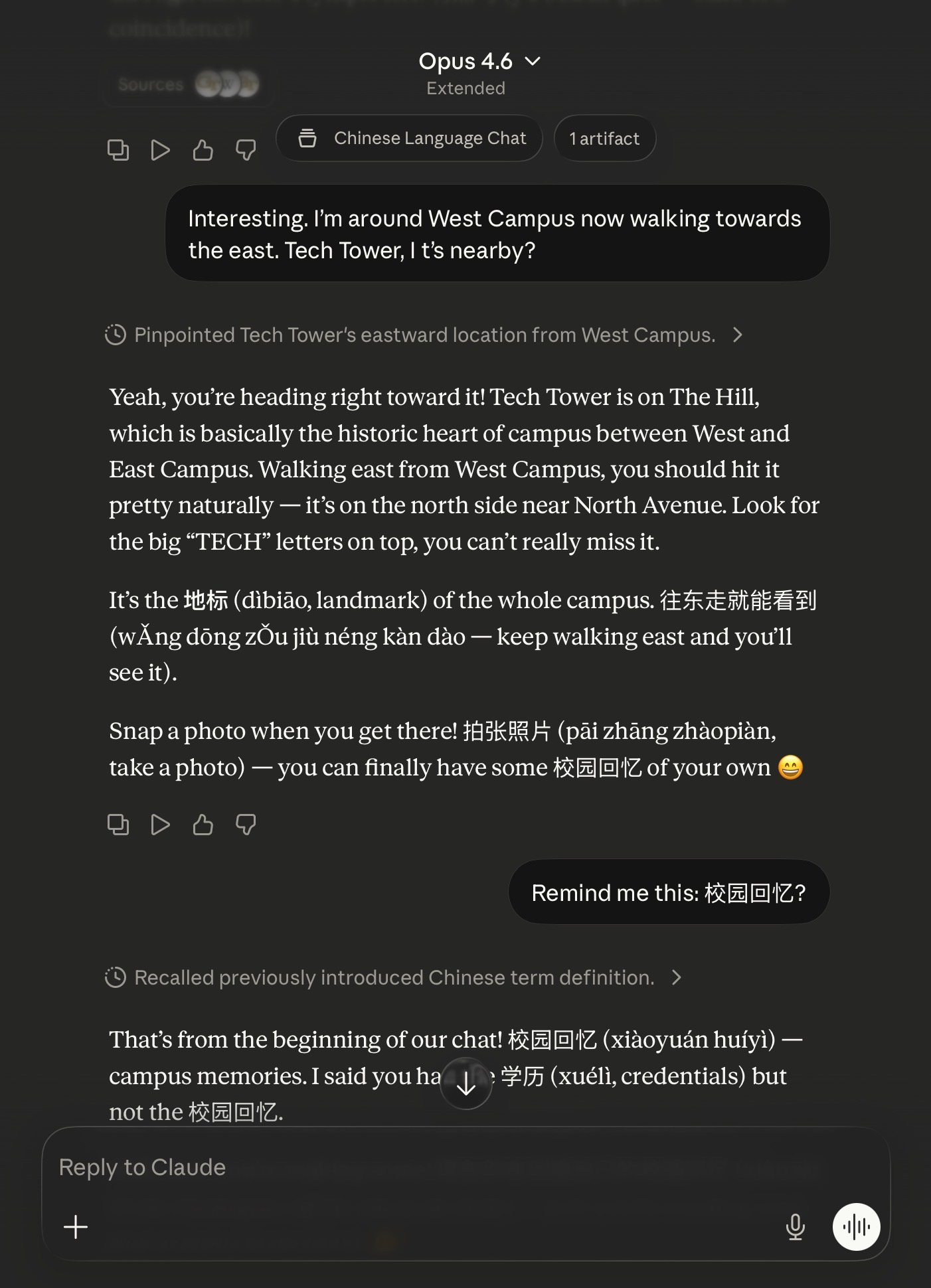 As seen above, I was at Georgia Tech recently for my book tour. I was wandering around campus and having a casual chat about landmarks to look at. Instead of simply opening a “normal chat,” I used my Project called “Chinese Language Chat” (you can see the beginning of the instructions above). This has standing instructions to utilize Chinese language terms with pinyin (the “romanized” letters you see) and explain the meaning.