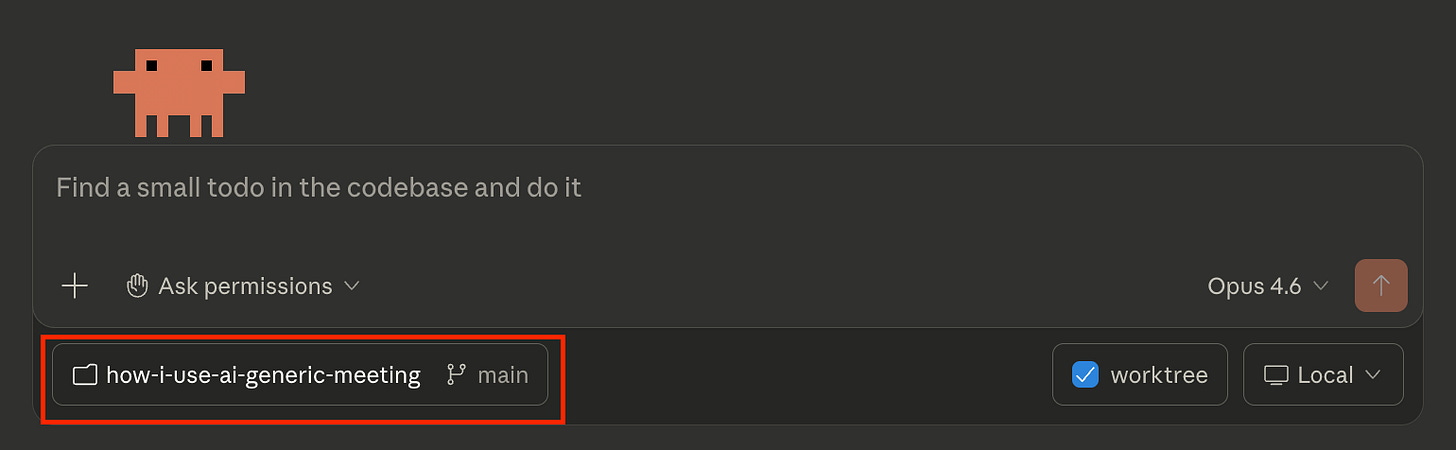Terminal(Mac) orPowershell(Windows) and run:claude --dangerously-skip-permissions.OR, if you’re using the desktop app, select the folder you put my repo into (and unzipped, if you downloaded it as one) and select main.