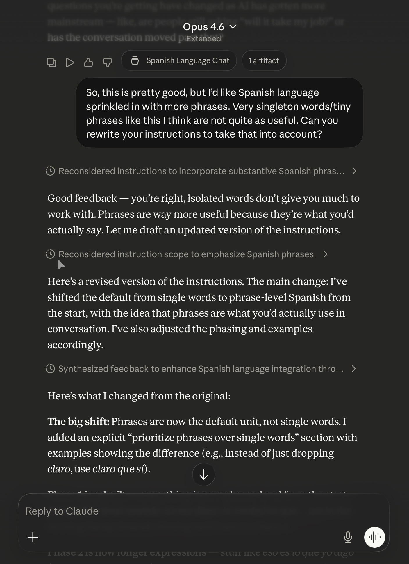 My Chinese is... reasonable. My Spanish is worse. However, I found that the adapted version of my Chinese language chat in Spanish (accounting for my level) was too easy. Or rather, it gave single words that were too short and without context to really be of use. So, I asked to have it changed.