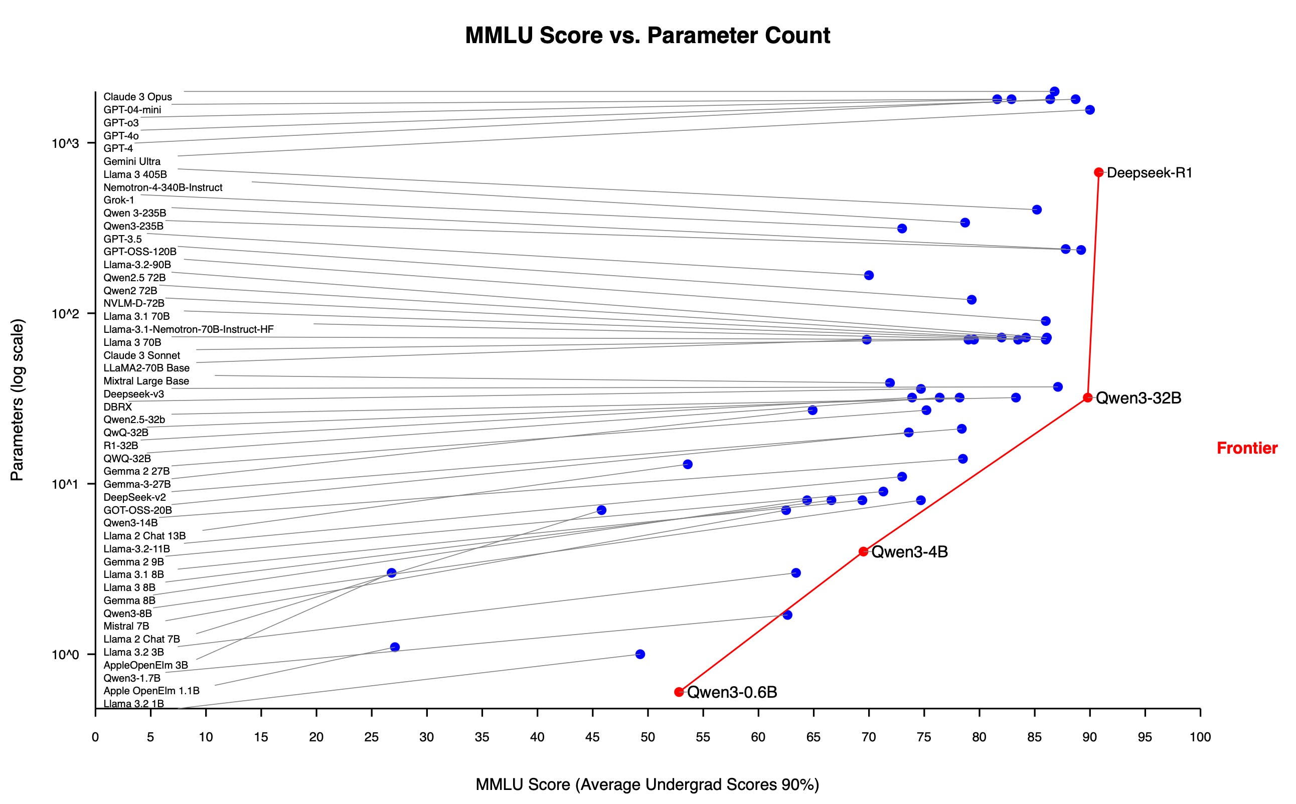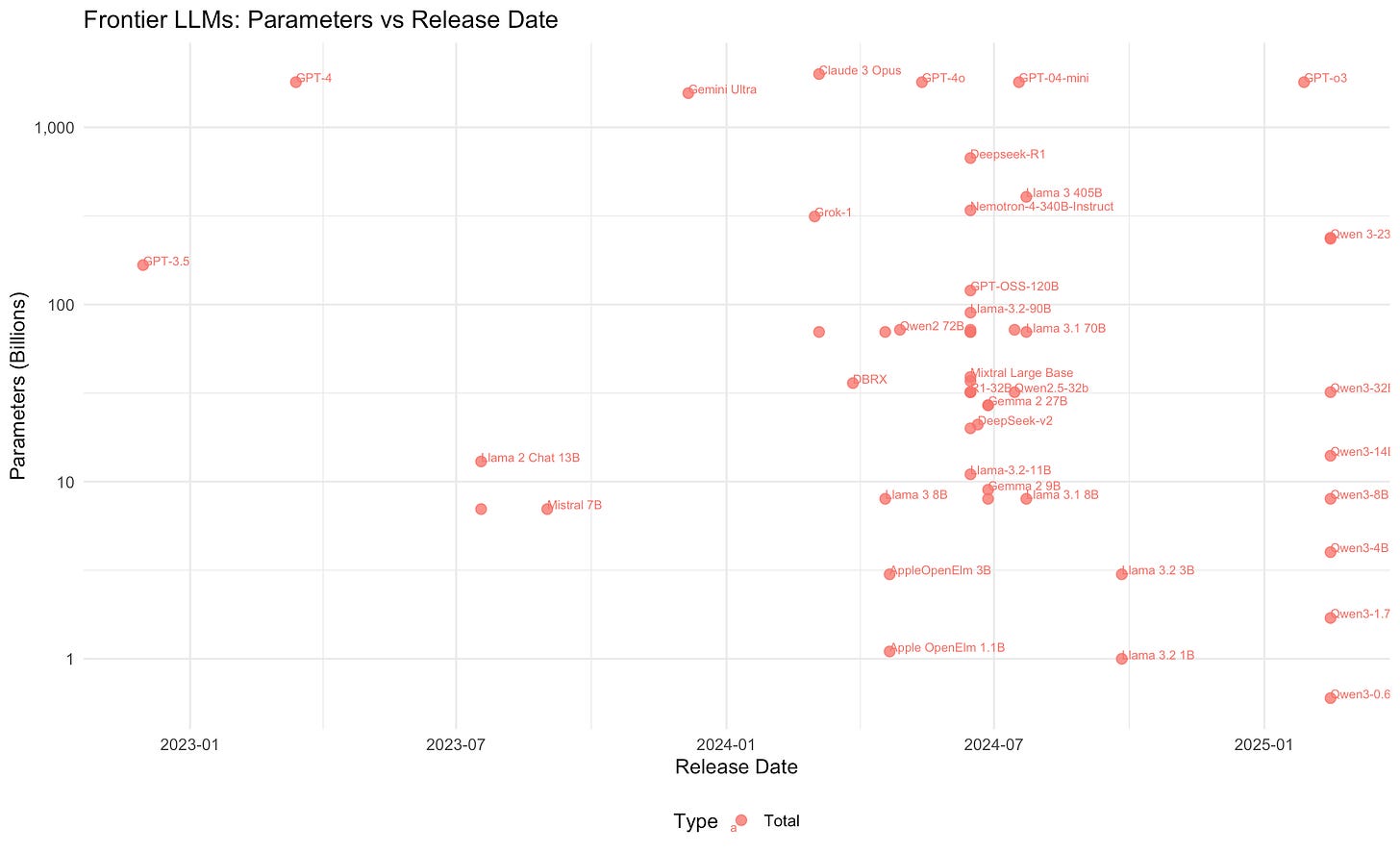 That turned out to not be the case—so much so that it’s actually extremely hard to find a good chart of model parameter sizes. Part of that was because since 2023, we have Mixture of Experts (MoE) models—which many major models now utilize—that make apples-to-apples comparisons hard. That means that traditional “dense” models vs. MoE models, which only activate certain portions of their parameters for certain problems, are hard to directly compare. Additionally, many model providers, like OpenAI, explicitly stopped publishing the sizes of their models.