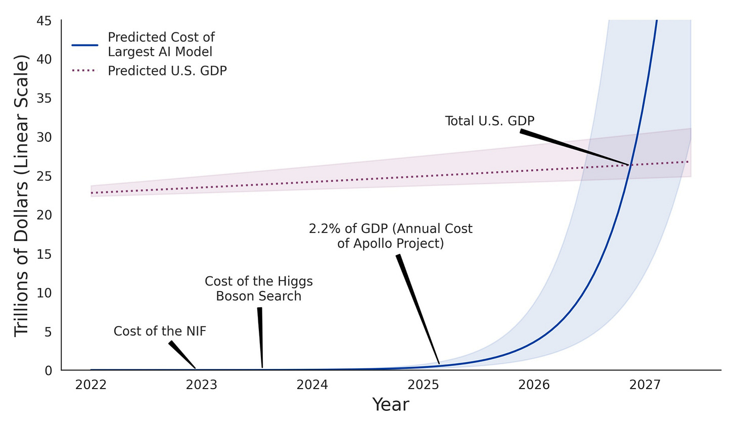 In 2022, the Center for Emerging Technology and Security (CSET) projected that by 2030-2040, AI model costs would exceed total US GDP. A few months ago people were freaking out about AI consuming all of the world’s water. A few days ago, Apollo provocatively stated that the AI energy gap “will not be closed in our lifetime.”