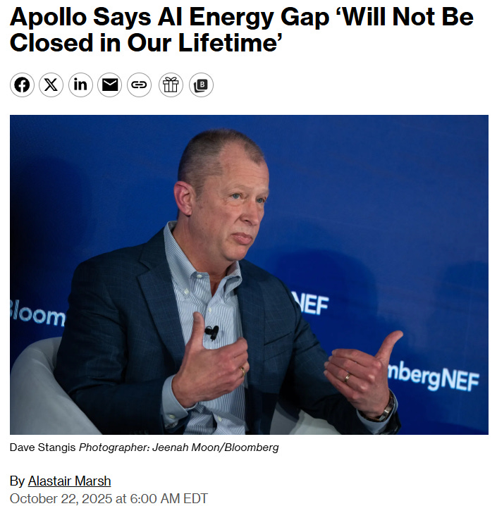 The latest example was from an Apollo executive who said, “The gap between what AI is demanding and what we have everywhere in the world on the grid in terms of generation and transmission is huge and will not be closed in our lifetime.”