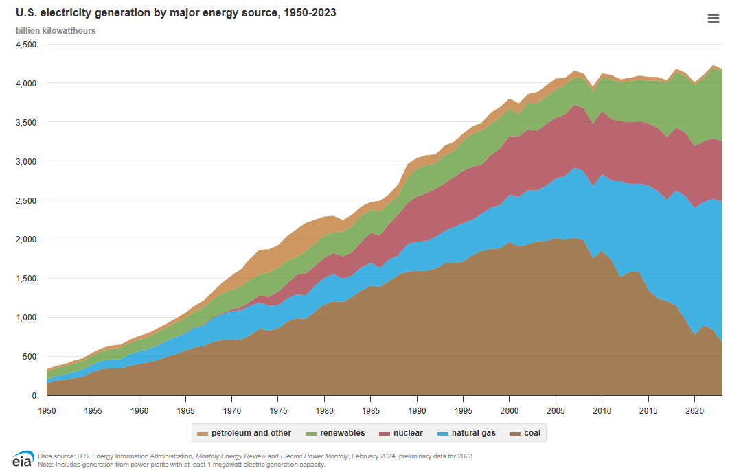 Natural gas is now our largest source of electricity and has grown at ~3.5% per year for the last decade. If it continues at that pace, it will add about 300 TWh on its own, and that pace could certainly be dialed up. For all intents and purposes we have infinite natural gas, and it is super cheap. We think this will be the largest contributor to the solution.