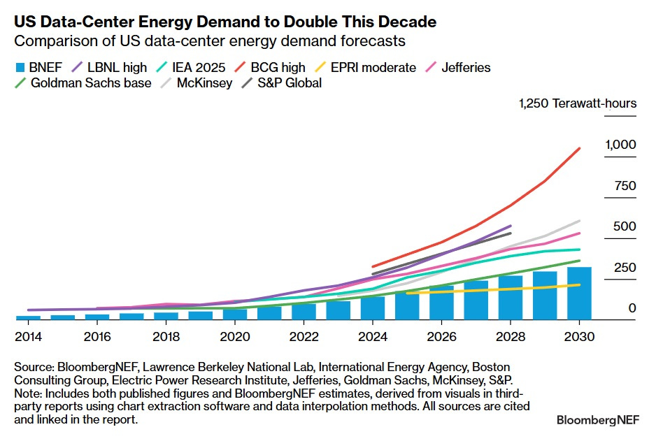 But let’s get specific. Here is a chart where a bunch of smart people sharpen their pencils and project how much juice all of these AI data centers will need. The estimates are comically different from each other: a ~5x range over the next 5 years.